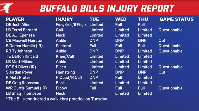 The Bills listed two players officially ruled OUT, CB Maxwell Hairston and S Jordan Poyer, setting an early tone for just how banged up this roster really is. A handful of key contributors were labeled QUESTIONABLE, including LB Terrel Bernard, RB Ty Johnson, DT Ed Oliver (IR), WR Curtis Samuel (IR), and S Damar Hamlin (IR).