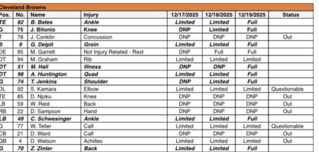The Browns enter Week 16 looking every bit like a team shifting into full tank mode, and their injury sheet backs it up. Cleveland ruled out six starters and key contributors; OT Jack Conklin, TE David Njoku, CB Denzel Ward, LB Winston Reid, RB Dylan Sampson, and QB Deshaun Watson. Only two players land as QUESTIONABLE, linebacker Sam Kamara and guard Wyatt Teller. The IR list is equally stacked with impact names, including center Ethan Pocic, running back Jerome Ford, defensive tackle Maliek Collins, corner Martin Emerson, offensive tackle Dawand Jones, and star linebacker Jeremiah Owusu-Koramoah. With so many core pieces shut down or sidelined, Cleveland’s depth will be heavily tested, and the contrast between the Browns’ lengthy list and the more streamlined Buffalo Bills injury report only amplifies the sense that the Browns are turning their focus toward the future rather than the win column.