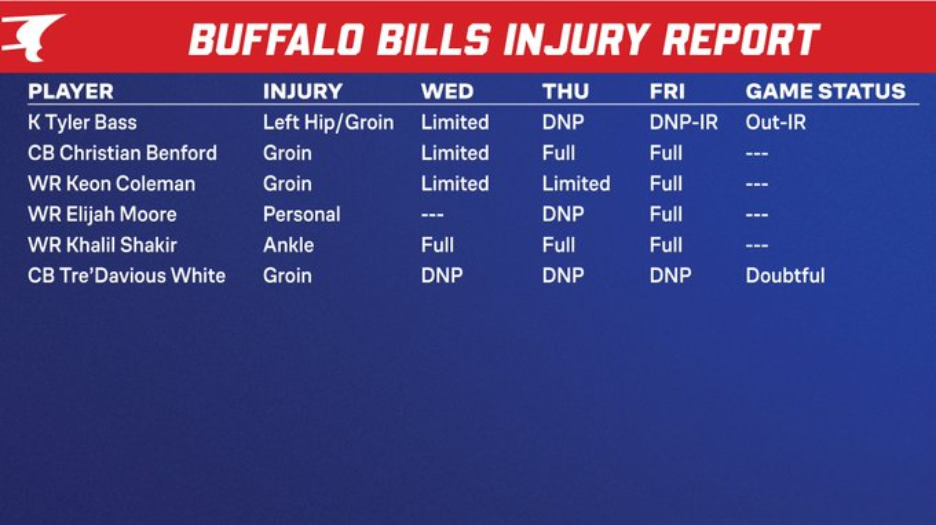 WR Keon Coleman; Breakout candidate Keon Coleman unexpectedly popped up on the injury report this week with a groin issue. Reports suggest this groin problem has been lingering since training camp, hinting at a potential chronic soft-tissue issue.