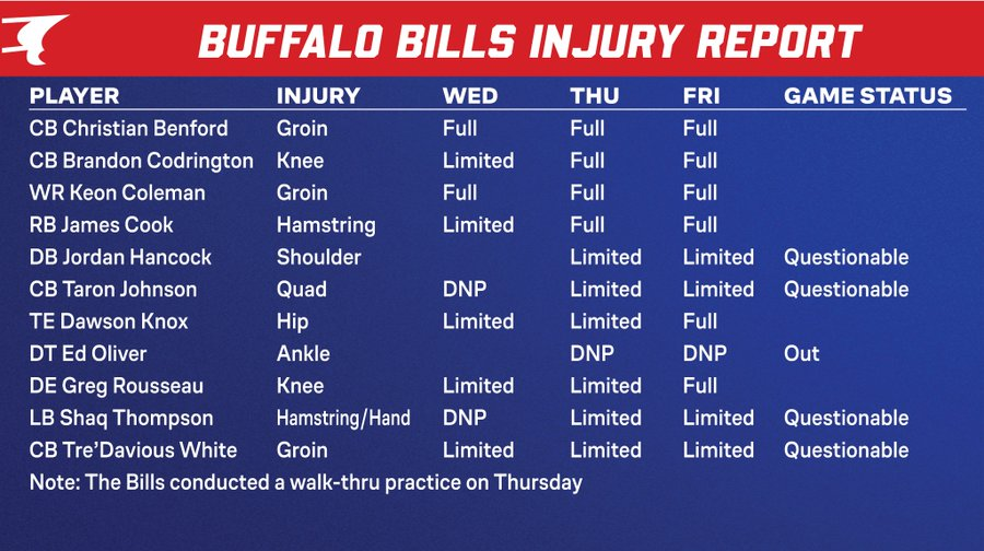 TE Dawson Knox; Listed with a hip issue this week. This is a designation he has had at several points in his career, which makes it unclear whether it’s a new injury or a lingering concern. He practiced limited Wednesday and Thursday but returned to full participation Friday. Knox is coming off a game where he logged 48 snaps (56%), slightly outpacing fellow TE Dalton Kincaid, who finished with 43 snaps (51%).