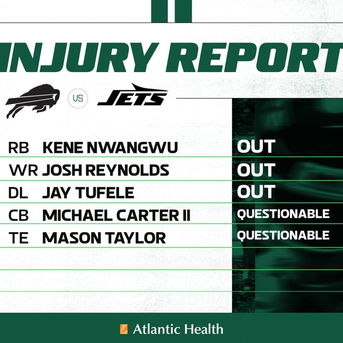 Meanwhile, the Jets aren’t exactly strutting into this one healthy either. They’ll be without wideout Josh Reynolds and defensive lineman Jay Tufele, thinning out both ends of the roster. Cornerback Michael Carter II and tight end Mason Taylor are listed as questionable, and for a team already searching for an identity, those question marks could make things even bleaker. Also notable is offensive guard, Alijah Vera-Tucker, is on the IR list.