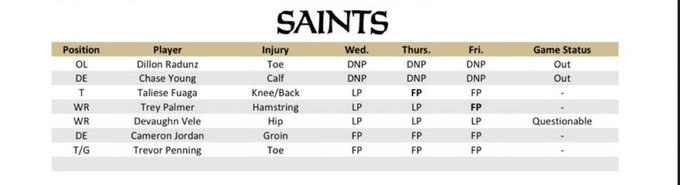 On the other side, the New Orleans Saints are desperate to find their footing after a tough start to the season. They’ll be shorthanded up front and on defense, with OL Dillon Radunz and DE Chase Young ruled OUT. Wide receiver Devaughn Vele is also listed as QUESTIONABLE, adding even more uncertainty to an offense that’s still searching for consistency.