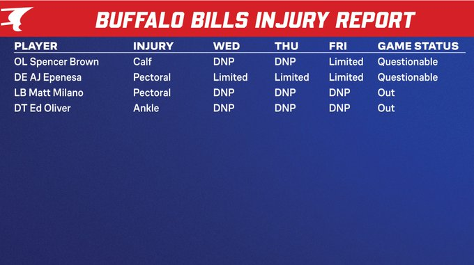 OT Spencer Brown; Right tackle Spencer Brown popped up on the injury report this week with a calf issue. Brown himself downplayed it a bit on One Bills Live, saying his calf “got a little weird” on him last week but that he was able to finish the game.