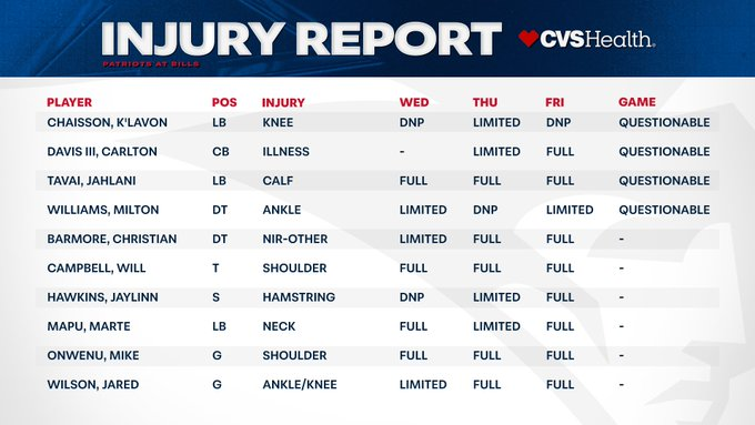 NFL Week 5 Injury Report: Buffalo Bills vs New England Patriots