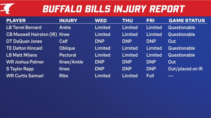But this matchup isn’t just about vibes and rebound energy, it’s about survival through injuries. The Bills enter Week 8 banged-up once again, with LB Matt Milano, LB Terrel Bernard, and TE Dalton Kincaid all listed as QUESTIONABLE heading into Sunday. Two key contributors won’t be suiting up: DT DaQuan Jones and WR Joshua Palmer are officially OUT, while S Taylor Rapp is headed to injured reserve. The good news? Buffalo finally injects some muscle back into the defensive front, welcoming back recently reinstated DE Michael Hoecht and DT Larry Ogunjobi. Plus, promising rookie corner Maxwell Hairston is now in his 21-day practice window, though a return is more likely around Week 10.